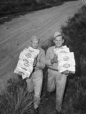 The 45th Infantry Division is visiting Fort Worth, Texas from Camp Barkeley in Abilene, Texas. Pictured, left to right are Private Melvin Gibbons and Private Van Williams. They are walking along the side of the road, each carrying a stack of Taystee Bread. Private Gibbons, of Hobbs, New Mexico, is wearing a hat, button-up shirt, and trousers. Private Williams, of Duncan, Oklahoma is dressed in a side cap, button-up shirt, and trousers.