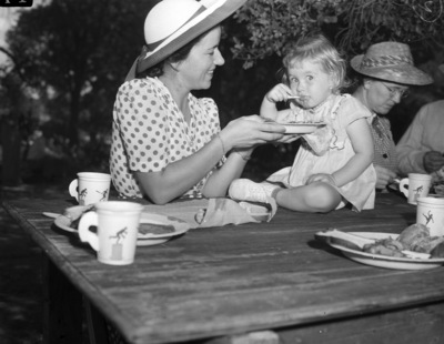 The Texas Aberdeen-Angus Breeders Association held a field day at the Tommy Brook Ranch. Mrs. Bert Smith is shown with her daughter, Helen Mack, eating lunch. Helen is sitting on the picnic table, feeding herself while Mrs. Smith holds the plate for her. Mrs. Smith is wearing a polka-dot dress.