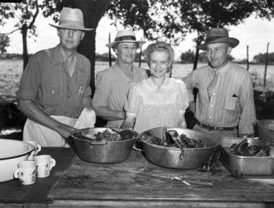 Barbecues; Field Days; Food; Ranches; Ranchers; Cattle breeders; Tommy Brook Ranch; Brook, Tommy; Brook, Tommy (Mrs.); Brook, Lewis (Mrs.); McSwain, R. F.; Dresses; Texas Aberdeen-Angus Association; Texas Aberdeen-Angus Breeders Association