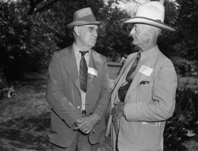 The 45th annual Cowboy Reunion and Rodeo is being held in Seymour, Texas, on July 24 and 25. Some of the long-time residents in attendance, left to right, are Charles E. Coombes and J. A. Wheat. The men are well known West Texas lawyers. Mr. Coombes, of Stamford, Texas, is dressed in a hat and a suit. Mr. Wheat is wearing a cowboy hat and a pinstripe suit.