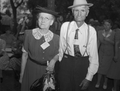 The 45th annual Cowboy Reunion and Rodeo is being held in Seymour, Texas, on July 24 and 25. Some of the long-time residents in attendance are Mr. and Mrs. W. B. Self. Mrs. Self is 74 years old and has been a resident of Seymour since 1884. She is wearing a hat and a button-up dress with a lace collar. Mr. Self is 81 years old and moved to Seymour in 1880. He is dressed in a hat, collared shirt, necktie tie, suspenders, and trousers.