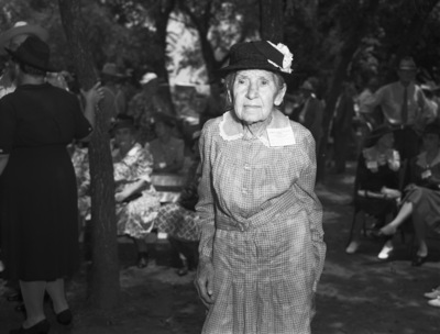 The 45th annual Cowboy Reunion and Rodeo is being held in Seymour, Texas, on July 24 and 25. Attending the early day settlers' reunion, is Mrs. S. A. Brookins. She is 93 years old and a long-time resident of Seymour, Texas. Mrs. Brookins is wearing a hat and a floral and checkered dress.