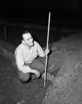 Sam Buron, president of the Fort Worth Hockey Club, measures 30" hole dug in floor of Will Rogers Coliseum to prepare for freezing machinery to make an ice rink. Mr. Buron is wearing a long sleeve shirt, eyeglasses, and pants. He is smiling while holding the stick, there is dirt from the excavation around him.