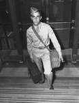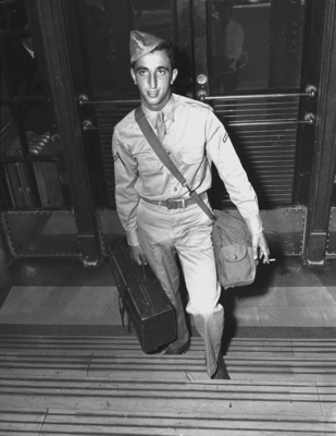 Private First Class Irvin Weitzman is a soldier in the United States Army. He hitch-hiked from Milwaukee, Wisconsin, to spend the weekend in Fort Worth, Texas, with his brother. Private Weitzman will report to Camp Livingston, Louisiana, at the end of his 15-day leave. He is shown climbing steps with a suitcase in hand and a bag slung over his shoulder. He is dressed in his military uniform and is holding a cigarette in his left hand.