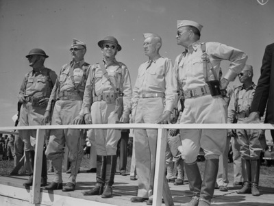 The Thirty-sixth Division, all-Texas unit, made its final appearance in review Saturday at Camp Bowie before departure early next month for extensive maneuvers in Louisiana and East Texas. It started its occupation of the Brownwood camp last December and began its current training program January 13th. For a brief period, all of the division's generals were grouped on the reviewing stand with Major General George V. Strong, commander of the VIII Army Corps, who "took" the review. Left to right are Brigadier General Preston A. Wetherred, 72nd Infantry Brigade; Brigadier General Robert O. Whiteaker, 61st Field Artillery Brigade who was commanding officer of troops for the event; Brigadier General Eugene A. Eversberg, 71st Infantry Brigade; General Strong; and Major General Claude V. Birkhead, commander of the 36th.