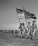 The Thirty-sixth Division, all-Texas unit, made its final appearance in review Saturday at Camp Bowie before departure early next month for extensive maneuvers in Louisiana and East Texas. It started its occupation of the Brownwood camp last December and began its current training program January 13th. Seen here are the Colors of the 143rd Infantry, a regiment headquartered at Waco in National Guard days with its membership extending into the Houston area.