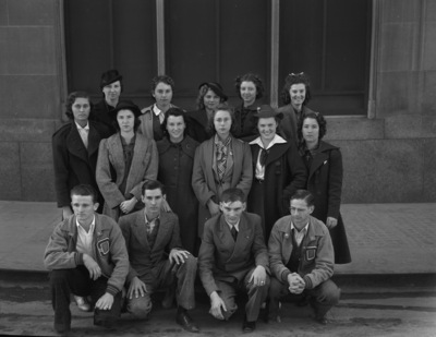 Members of the journalism class of Olney High School, who were recently in Fort Worth to inspect industrial plants and other points of interest are, left to right, front row, Johnnie Collings, Richard Wainwright, Leon Clanahan and Davie Hays; second row, Edith Harris, Jean Wolverton, Williadean Jackson, Dorris Pollard, Margaret Baldwin, and Doris Cook; third row, Miss Edith Hudson, teacher, and Juanita Head, Faye Bowden, Willie Estel Logan and Marian Morrison. The picture was made when the group visited the Star-Telegram. Published in the Fort Worth Star-Telegram morning edition, February 18, 1940.