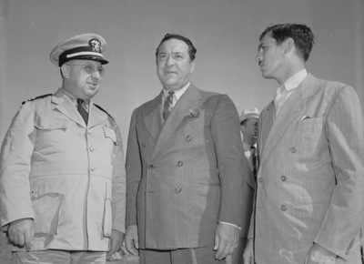 The Thirty-sixth Division, all-Texas unit, made its final appearance in review Saturday at Camp Bowie before departure early next month for extensive maneuvers in Louisiana and East Texas. It started its occupation of the Brownwood camp last December and began its current training program January 13th. Three of the Houston Delegation which flew to the view included, left to right, Lieutenant Commander E. E. Kerr, commander of the Naval Reserve for the Houston area; Lieutenant Colonel Sam W. Becker, vice chairman of the chamber of commerce military affairs who started with the 36th and wound up in the 42nd (Rainbow) Division in the World War; and Major R. E. McKaughan, commander of the Texas Defense Guard's newly organized Air Branch Squadron Number 2.