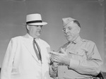 The Thirty-sixth Division, all-Texas unit, made its final appearance in review Saturday at Camp Bowie before departure early next month for extensive maneuvers in Louisiana and East Texas. It started its occupation of the Brownwood camp last December and began its current training program January 13th. Brigadier General J. Watt Page, right, adjutant general of Texas, gives some pointers to J. K. Brim of Sulphur Springs, Texas, who represented Congressman Patman. Brim was a captain commanding Company D of the division's 144th Infantry in World War I. Brigadier General Page is seen holding a cigar, as Brim looks on.