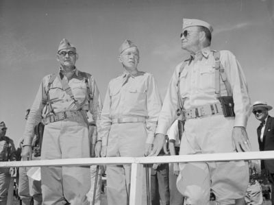 The Thirty-sixth Division, all-Texas unit, made its final appearance in review Saturday at Camp Bowie before departure early next month for extensive maneuvers in Louisiana and East Texas. It started its occupation of the Brownwood camp last December and began its current training program January 13th. Left to right, Brigadier General Robert O. Whiteaker, Major General George V. Strong and Major General Claude V. Birkhead look on from the review stands.