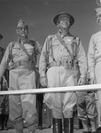 Guests at the 36th Division review at Camp Bowie included Brigadier General Eugene A. Eversberg, center, commander of the 71st Infantry Brigade. He is wearing his military uniform and eyeglasses. Unidentified military personnel are standing at his left and right.