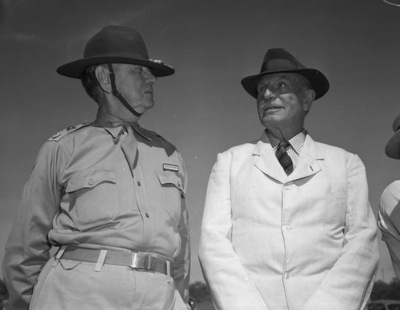 Attending the 36th Division review at Camp Bowie were Lieutenant Colonel Dallas J. Matthews, left, and Major General H. Dorey, retired, of Boerne, Texas. Lieutenant Matthews is wearing his military uniform. Major General Dorey is wearing a suit and a hat.