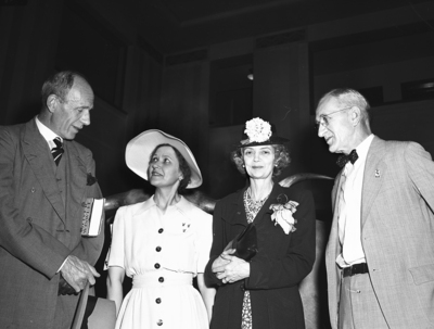 Brief visitors at Municipal Airport Saturday night were Lord and Lady Halifax. He is the British ambassador to the United States. Here are the dinstinguished visitors in the air port administration building with two members of an informal welcoming committee. Left to right, Lord Halifax, Mrs. J. C. Maxwell, Lady Halifax, and Herbert Walker.