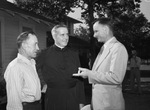 Ground breaking for Shrine at All Saints Catholic Church. Leo Czerwinski, John Maher and R. L. McCormick. Father Maher is chatting with the two leaders in the building program, which will eventually include a new church. Mr. Czerwinski is wearing a button-up shirt tucked into trousers. Father Maher is wearing his clerical clothing. Mr. McCormick is wearing a light-colored suit.