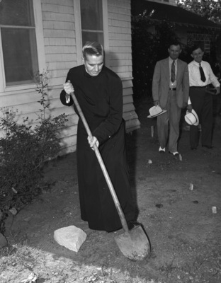 Ground breaking for Shrine at All Saints Catholic Church. Father John Maher as he turned the first shovel of earth and started construction of a stone shrine in honor of the Blessed Virgin. Father Maher is wearing his clerical clothing and holding a shovel. There are two men coming around the corner of the church. They are both wearing suits and carrying their hats.