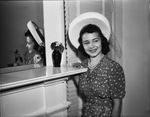 Miss Miriam Snodgrass is in Fort Worth, Texas, visiting her sister, Mrs. Harold Banks. Miss Snodgrass is a native of Sherman, Texas. She will be attending Texas State College for Women in Denton, Texas, next fall. Miss Snodgrass is shown standing beside the fireplace. She is wearing a wide-brimmed hat, floral dress and a pearl necklace. There is a mirror hanging above the mantel.