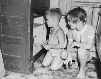 Unidentified boy and girl kneeling on the floor, looking in their empty ice box. The boy is wearing overalls and the girl is wearing a dress. The Star-Telegram Free Milk and Ice Fund runs on donations to provide for city families who have no other means of obtaining milk and ice.