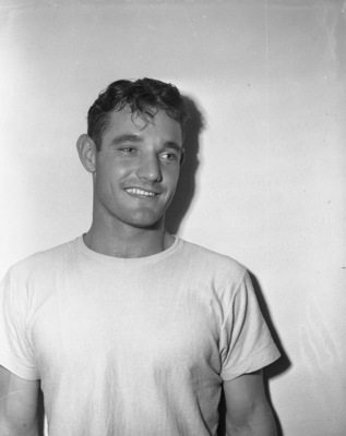 Lemuel "Lefty" Bumbers, pitcher for the Beaumont Ball Club. Mr. Bumbers is standing in front of an empty wall, wearing a t-shirt. He is smiling and looking off to his left.