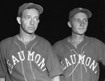 Beaumont Exporters baseball player Gordon Hinkle (left) with another, unnamed, Exporters player. Both men are wearing their baseball uniforms that read "Beaumont," on the front of the jerseys.