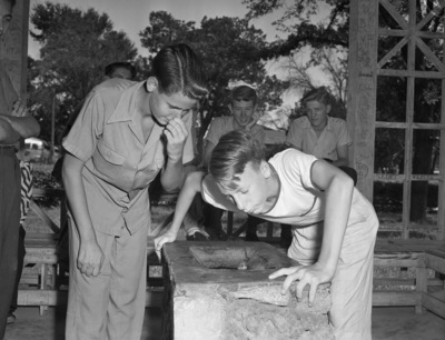 152 Star-Telegram carrier salesmen enjoyed a full day's outing at Glen Rose, Texas. Two of them are pictured here. Tom Chenault, left, holds his nose as Seaton Ewing takes a drink of sulfur water from the fountain. Published in the Fort Worth Star-Telegram evening edition, July 31, 1941.