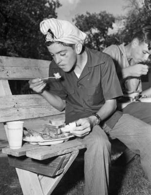 152 Star-Telegram carrier salesmen enjoyed a full day's outing at Glen Rose, Texas. One of them is shown here. John Allen goes after his third helping of fried chicken. He has a handkerchief tied on his head and is sitting on a bench. A paper cup and the plate of food is also sitting on the bench. Another unidentified boy is also sitting next to him and enjoying food. Published in the Fort Worth Star-Telegram evening edition, July 31, 1941.