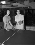 Ruth Budow of San Antonio, Texas, left, is visiting Miss Cecille Gilbert, right, daughter of Mrs. Julius Gilbert. They are next to the ping pong table and are holding ping pong paddles. Published in Fort Worth Star-Telegram, morning edition, August 5, 1941.