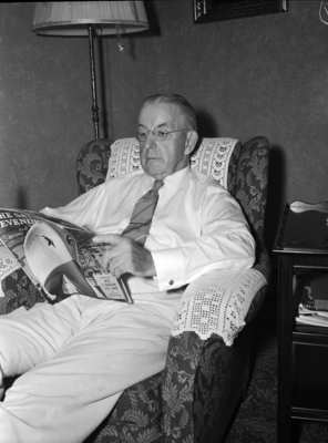 C. P. Richey has served 32 years as a city freight agent for the Santa Fe Railroad. Mr. Richey is retiring from his position a few days before he turns 70 years old. Seventy is the automatic retirement age. Mr. Richey is shown sitting in an arm chair, reading a magazine. He is dressed in a button-up shirt, necktie, and trousers.