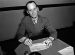 W. G. Shine is taking over the position of city freight agent for the Santa Fe Railroad. He is replacing C. P. Richey, who is retiring after 32 years of service. Mr. Shine has been the traveling freight agent in Fort Worth, Texas, since 1936. He is shown sitting at a desk, reading a Western Union telegram. He is dressed in a double breasted suit with a handkerchief in the pocket.