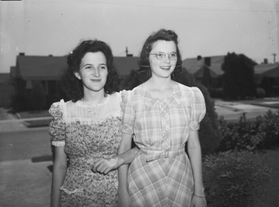 Fifteen-year-old twins are visiting Fort Worth, Texas, from Natchitoches, Louisiana. The twins, left to right, are Jacquelyn Cocke and Marian Cocke. They are the daughters of Mr. and Mrs. C. V. Cocke. Jacquelyn is wearing a floral dress with a lace collar. Marian is wearing a plaid dress, belted at the waist.