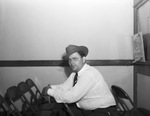 Ted Gouldy is a local radio artist with WBAP, one of the oldest radio stations in Texas. WBAP dates back to 1922. Mr. Gouldy is a farm-and-ranch announcer. He is shown sitting backwards on a fold-up chair. He is wearing a cowboy hat, dress shirt, necktie, and trousers.