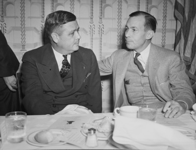 Principal speaker at the Lincoln anniversary dinner sponsored by the Tarrant County Republican Club at Hotel Texas was Herbert K. Hyde, of Oklahoma City, Oklahoma, left, former United States district attorney there and former Republican candidate for the Senate. He was introduced by Doctor Frank Schoonover, right. Both men are sitting at a dining table, wearing suits.