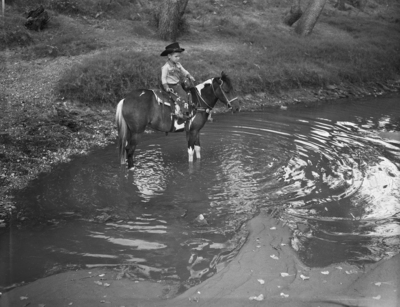 Don Kay "Brown Jug" Reynolds is the three-year-old son of Mr. and Mrs. Fess Reynolds. They live in Odell, Texas. Don Kay is shown riding a pony. They are crossing the shallow end of a stream. Don Kay is dressed in a cowboy hat, western shirt, and chaps embroidered with his initials.