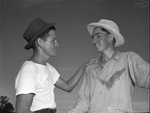 Charles "Spud" Cason (left) and Billy Morris played against each other in the semifinals of the Fort Worth, Texas, golf tournament. Cason won the match, 2-1. The two golfers are standing outdoors. Cason is wearing a short-sleeve shirt and a hat and has his left arm on Morris's right shoulder. Morris is wearing a long-sleeve shirt and a hat.