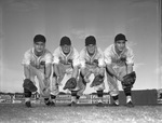 Fort Worth Cats infield players (left to right) Charley Baron, Clyde McDowell, Bill Skelley and Joe Greenberg. The four basemen are standing next to each other, knees bent and bodies leaned forward. They are all wearing the Cats baseball uniform and a baseball glove in their hands. Behind them, the rest of the baseball field can be seen.