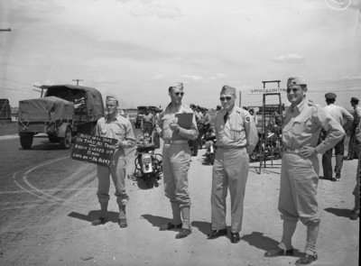 45th Division troops from Camp Barkeley passed through Fort Worth, Texas, en route to Louisiana. Helping to ensure the troops passed through smoothly were, left to right, Private R. C. Locke, Major Forest R. Armstrong, Major John W. Herbert and Lieutenant Colonel Jess Larson. Private Locke is holding a sign of convoy orders, reading, "Police Will Take You Thru All Traffic / March Closed Up / 15 M. P. H. / Caps On - Be Alert." Major Forest R. Armstrong checked the time of arrival of the units. Major Herbert's Texas Defense Guard companies aided in handling traffic along the convoy route. Lieutenant Colonel Larson was in command of the control point. The officers are standing along the side of the road. Behind them is a motorcycle. On the road are trucks carrying the soldiers who are passing through.