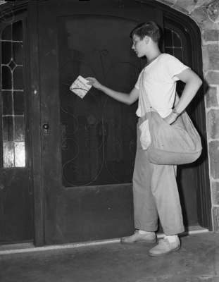Members of the Masonic Home High School Football team are working and enjoying their summers before returning to practice. Charley Renaud Junior is delivering newspapers to the Arlington Heights neighborhood of Fort Worth, Texas. He is attempting to finish his route in a hurry, so afterwards he can go swimming at Eagle Mountain Lake. Charley is dressed in a t-shirt and trousers. He is carrying a bag strung over his shoulder. The heavy cotton bag is double stitched and riveted and has a contrasting color pocket on the front. The young man is wearing a wrist watch with a metal band. The porch of the house has an elaborate arched door, framed on each side with leaded glass sidelights. The screen door has a simple dark doorknob and a reinforced curly metal frame protecting the screen. The young man's pants have a bottom cuff and he is wearing ribbed socks and cloth shoes with a simple tie that runs around the top of each shoe. The newspaper is the Fort Worth Star-Telegram. Star-Telegram photo, published Morning August 3.