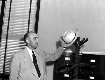Doctor M. E. Sadler is the new president of Texas Christian University (T. C. U.). He is shown "officially" taking over the post in a ceremony consisting of hanging up his hat and going to work. Dr. Sadler is dressed in a double breasted suit. There is a filing cabinet behind the coat rack.