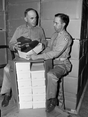 Hanna, Harvey E. (Lt. Col.); Silcox, Ray (Lt.); Fort Worth Quartermaster Depot; Military; Military personnel; Military uniforms; Military Supplies; Shoes; Shoe Boxes; Packaging
