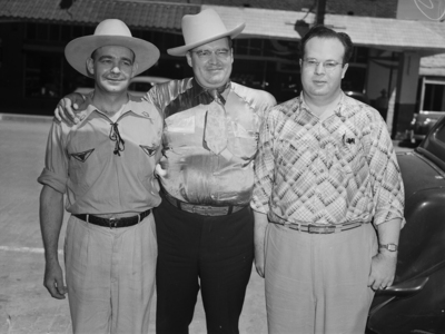 The Sixth Annual XIT Rodeo and Reunion is being held in Dalhart, Texas. The lively event draws large crowds, often doubling the town's population. In attendance, left to right, are Dale Dickerson, Dr. Victor R. Moore, and Kenneth G. Martin. Mr. Dickerson is wearing a wide brimmed hat, button-up shirt with cuffed sleeves, and trousers. Dr. Moore is dressed in a cowboy hat, button-up shirt, necktie, and trousers. Mr. Martin is wearing a patterned button-up shirt and trousers.