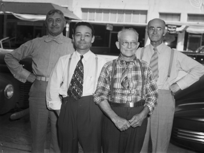 The Sixth Annual XIT Rodeo and Reunion is being held in Dalhart, Texas. The lively event draws large crowds, often doubling the town's population. In attendance, left to right, are I. J. Gushwa, G. A. Wolf, W. A. Wolf, and D. C. Atkinson. Mr. Gushwa is dressed in a button-up shirt, bow tie, and trousers. Mr. G. A. Wolf is wearing a dress shirt, necktie, trousers, and suspenders. Mr. W. A. Wolf is dressed in a plaid button-up shirt, necktie, trousers, and suspenders. Mr. Atkinson is wearing a button-up shirt, necktie, trousers, and suspenders. There are parked automobiles in the background.
