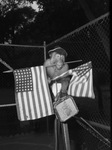One of the Forest Park Zoo's new animal actors is "David," a pigtailed monkey. He won the cheers of the crowd and his trainer Gilmore Fry with a patriotic wire act. David is holding two American flags, one in is mouth, and a case with the picture of a ship. He is wearing a hat and trousers as he balances on a pole.