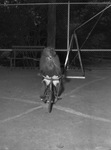 One of the Forest Park Zoo's new animal actors is "Buck," the baboon. He won the cheers of the crowd and his trainer Gilmore Fry when he came out riding a bicycle. Buck is wearing trousers and looking out into the crowd.
