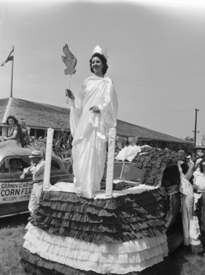 Johnson County Pioneers and Old Settlers Reunion. Miss Florence Mills of Alvarado, Texas, riding on a float. She stands dressed like the Liberty Statue. Published on August 7, 1941.