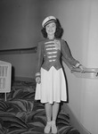 Nancybelle Webster, seventeen year old daughter of Mr. and Mrs. H. J. Webster, popcorn salesgirl at Bowie Theater. Photograph depicting young lady standing on carpeted stairs. She is posed, smiling and wearing a uniform. The uniform top is dark colored with long sleeves and shiny gold bars across the front. The bottom part of the uniform is a white skirt. She is wearing a white, nautical type hat and white shoes. Published August 8, 1941.