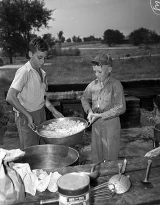 At the 4-H Club boys' encampment at Lake Worth, Texas, two boys from Pilot Point, Texas, George Riley (left) and Jack Mann, are pouring a dishpan of peeled potatoes into a kettle. George is wearing a short-sleeve collared shirt and trousers. Jack is wearing a long-sleeve shirt, trousers and a cap. On the table in the foreground are various cooking utensils.