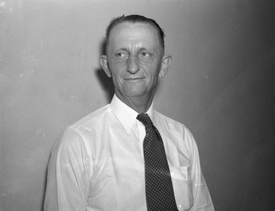 John Stinzendorfer, manager of Thurber Lake, Thurber, Texas. Mr. Stinzendorfer is seen to be wearing a tie and standing against the wall. Published in the Fort Worth Star-Telegram.