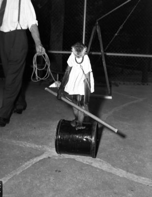 Image shows one of the Forest Park Zoo's new animal actors is a monkey. He won the cheers of the crowd and his trainer Gilmore Fry when he came out riding a barrel and holding a stick. The monkey is wearing a dress. Published in the Fort Worth Star-Telegram morning edition August 6, 1941.