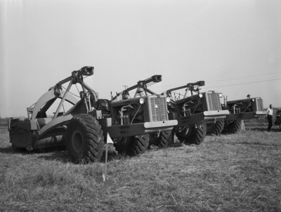 Shot of three new type ten-ton tournapulls to be used in construction of bomber assembly plant airfield.