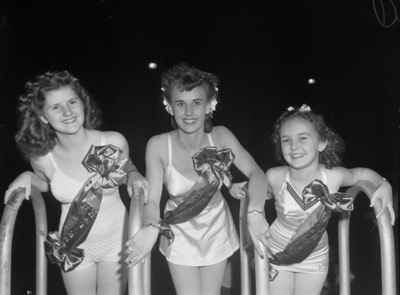 Recreation Department Health and Beauty revue. Winners: Miss Martha Turner, 17, senior contest winner; prettiest of the 13-to-14 year olds was Miss Marjorie Mae Andrews, left, and cutest of the juniors was Miss Charlotte Swart, seen in their ribbons and bathing suits.