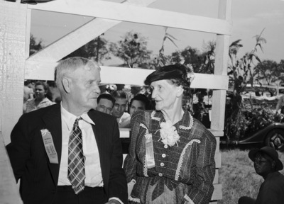 Johnson County Pioneers and Old Settlers Reunion. Mr. and Mrs. M. T. Clowdus, second oldest married couple. Half-length portrait. They look at each other. Mr. Clowdus is wearing a suit with a ribbon. Mrs. Clowdus is wearing a dress with a ribbon. There are other people standing in the background. Published on August 7, 1941.